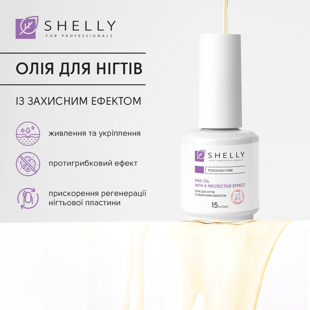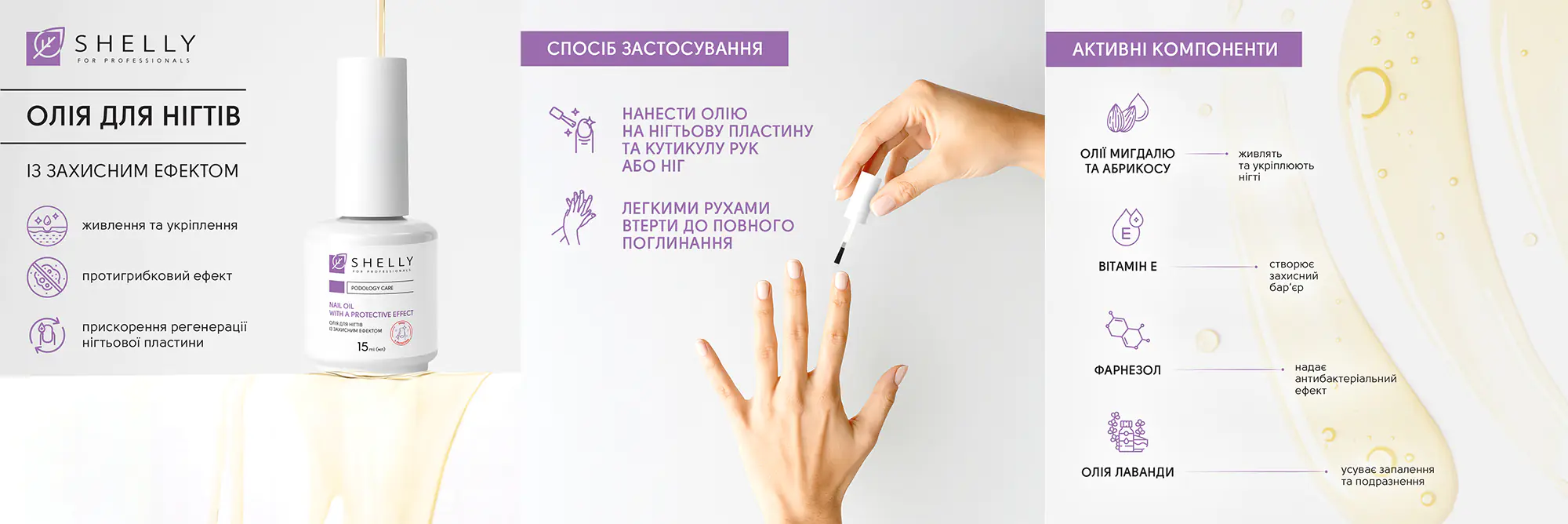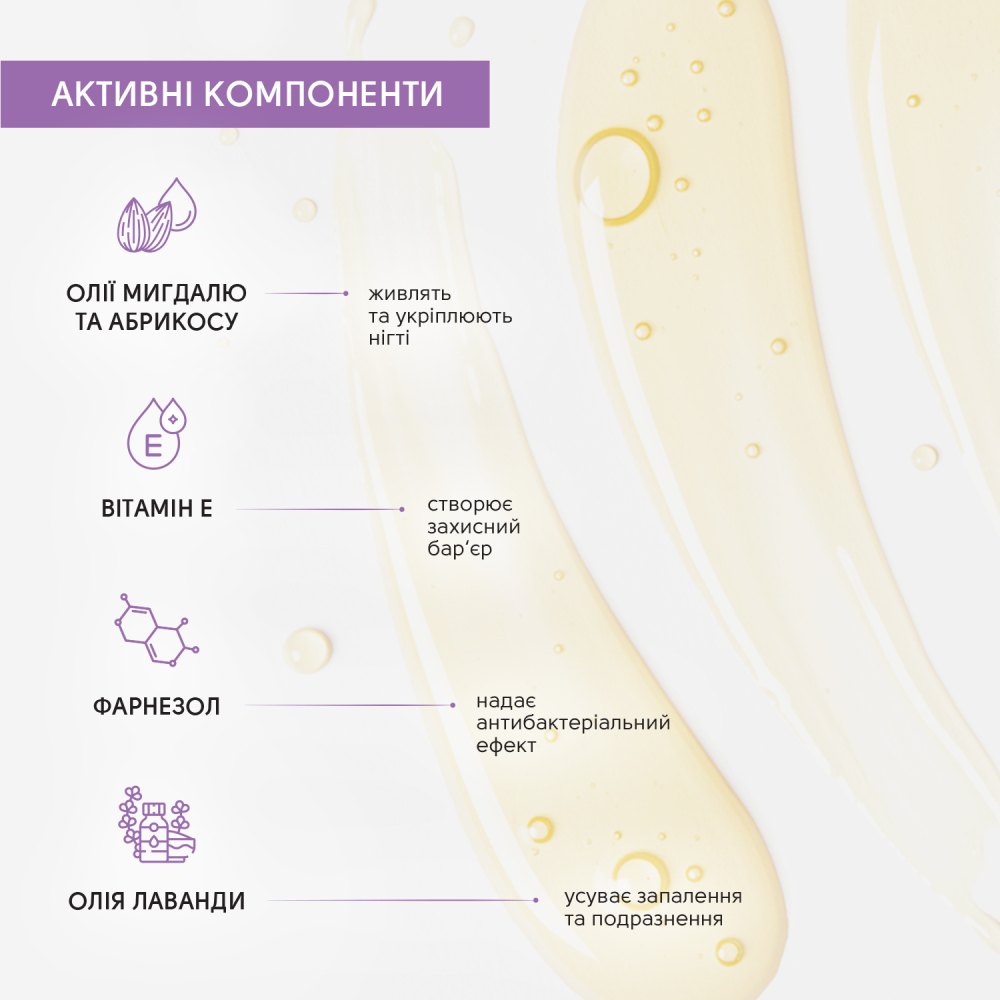 Формула на основі натуральних рослинних олій та активних компонентів живить нігтьову пластину, пом’якшує кутикулу та сприяє відновленню нігтів, пошкоджених унаслідок використання агресивної техніки нанесення та зняття гель-лакового покриття, миючих засобів або частих процедур манікюру та педикюру.