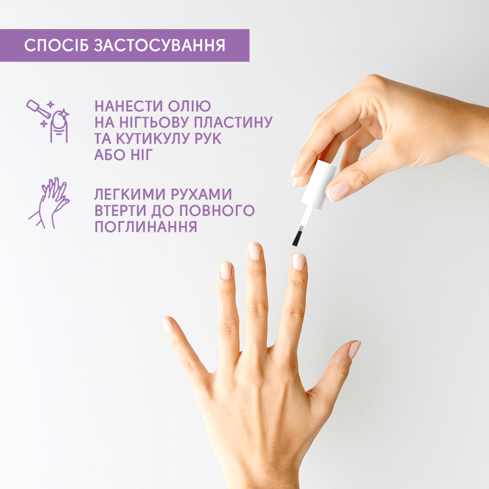 Нанести олію на нігтьову пластину та кутикулу, легкими рухами втерти до повного поглинання -