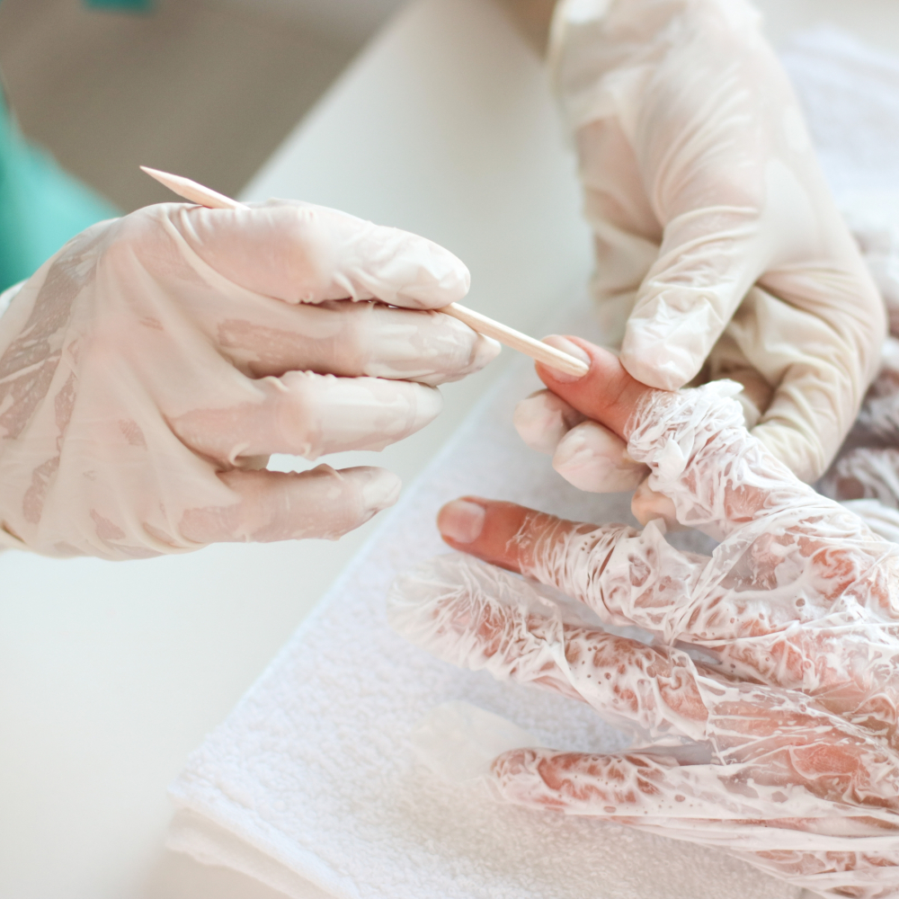 • очистити поверхню нігтів; • одягнути рукавички і зафіксувати спеціальною наклейкою; • помасажувати руки і зони навколо нігтів; • залишити на 10-15 хв.; • обережно зрізати верхню частину рукавички на кожному пальці; • обробити кутикулу, не знімаючи рукавичок; • зняти рукавички, видалити залишки емульсії з нігтів і рук. -