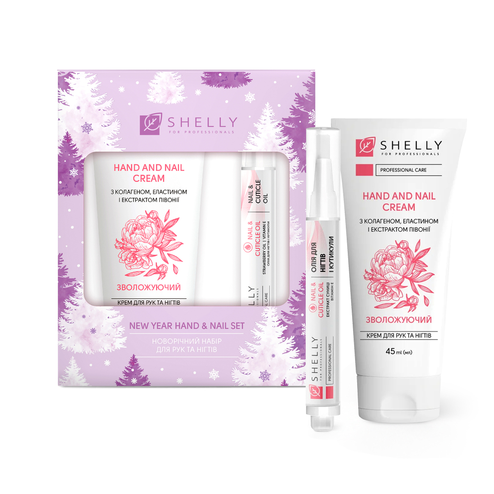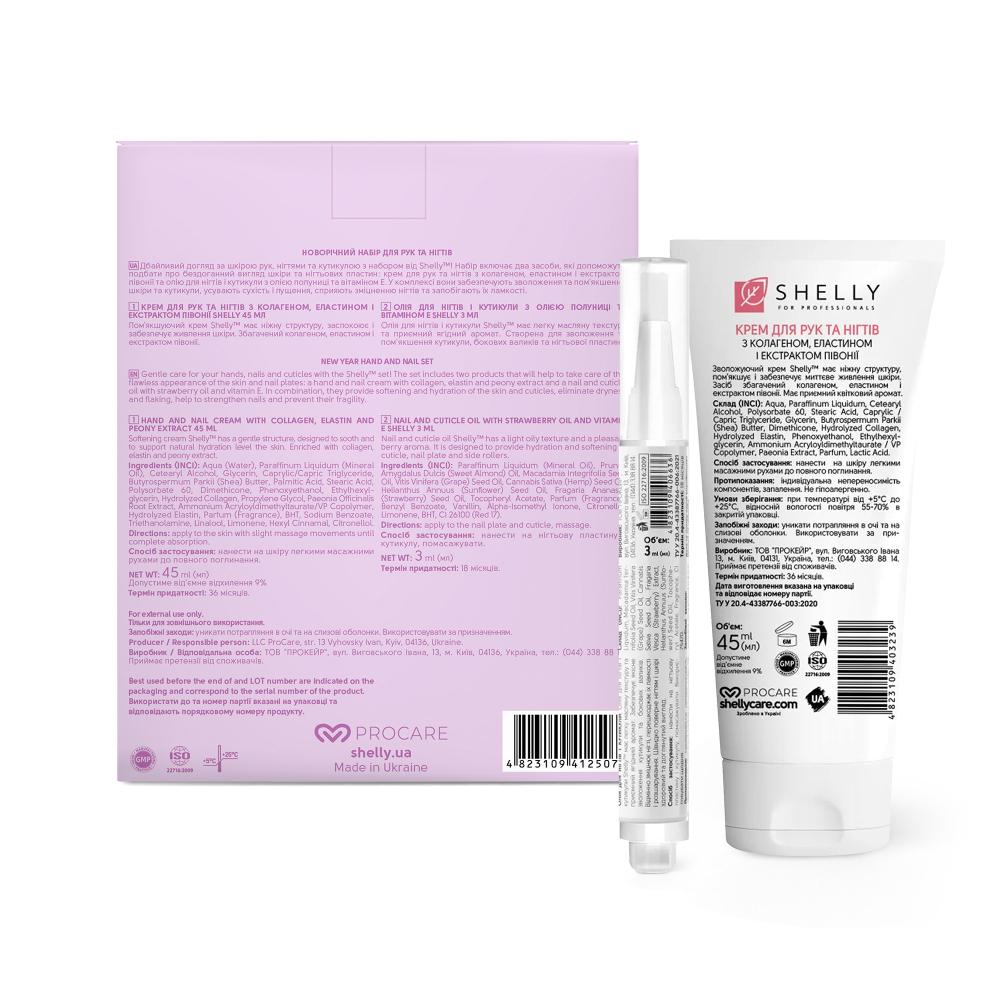 Крем для рук та нігтів з колагеном, еластином і екстрактом півонії Shelly - 45 мл Олія для нігтів і кутикули з олією полуниці та вітаміном Е Shelly - 3 мл -