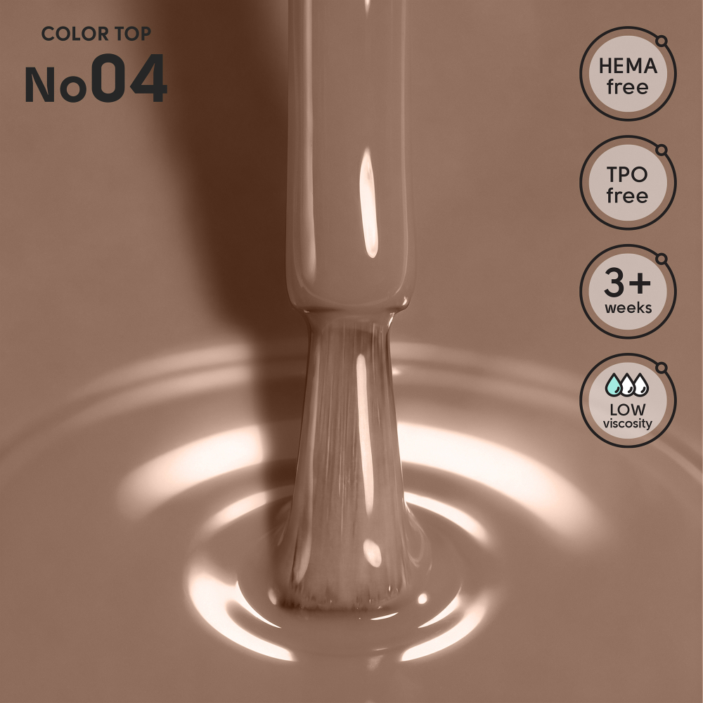 Цветной топ без липкого слоя - финишное покрытие, усиливающее насыщенность оттенка базы или геля и эффективно маскирующее незначительные недостатки покрытия. Позволяет получить более глубокий, равномерный цвет и обеспечивает деликатное камуфлирование без утяжеления ногтей. При необходимости может использоваться как самостоятельное покрытие на предварительно укрепленные ногти, создавая аккуратный, завершенный вид без дополнительного перекрытия. Материал обеспечивает стойкость покрытия более 3 недель, сохраняет форму и эстетичный вид. Не содержит HEMA и TPO.