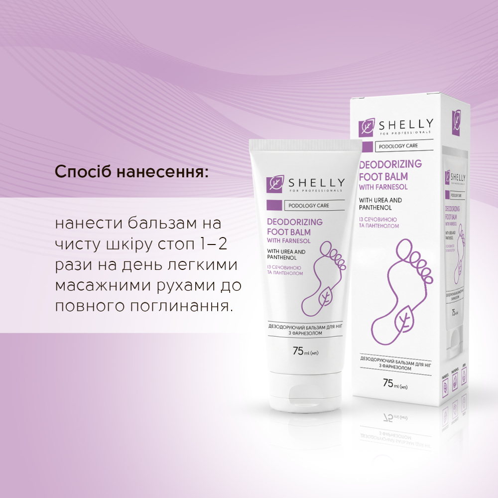 Нанесите бальзам на чистую кожу стоп 1–2 раза в день лёгкими массажными движениями до полного впитывания. -