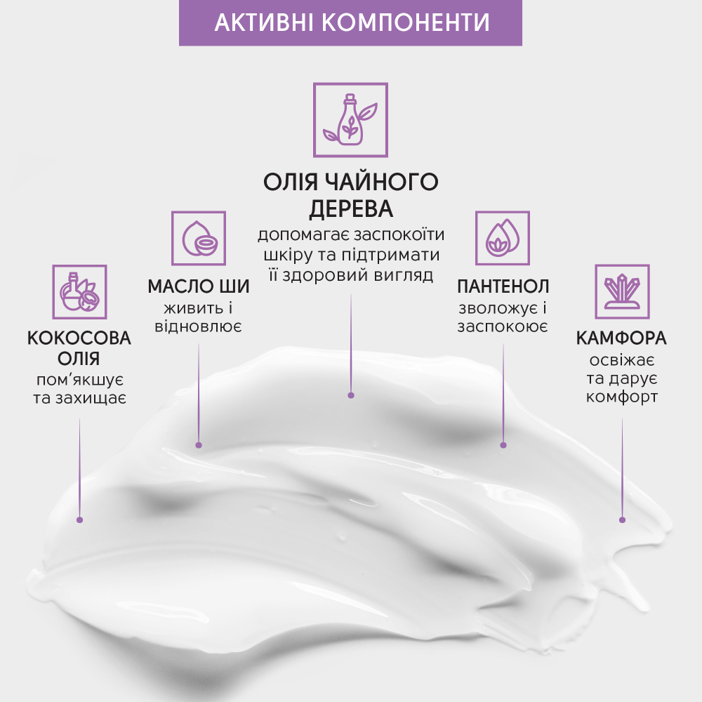 Пантенол, масло чайного дерева, камфора, масло ши, кокосовое масло, салициловая кислота, масло тмина -