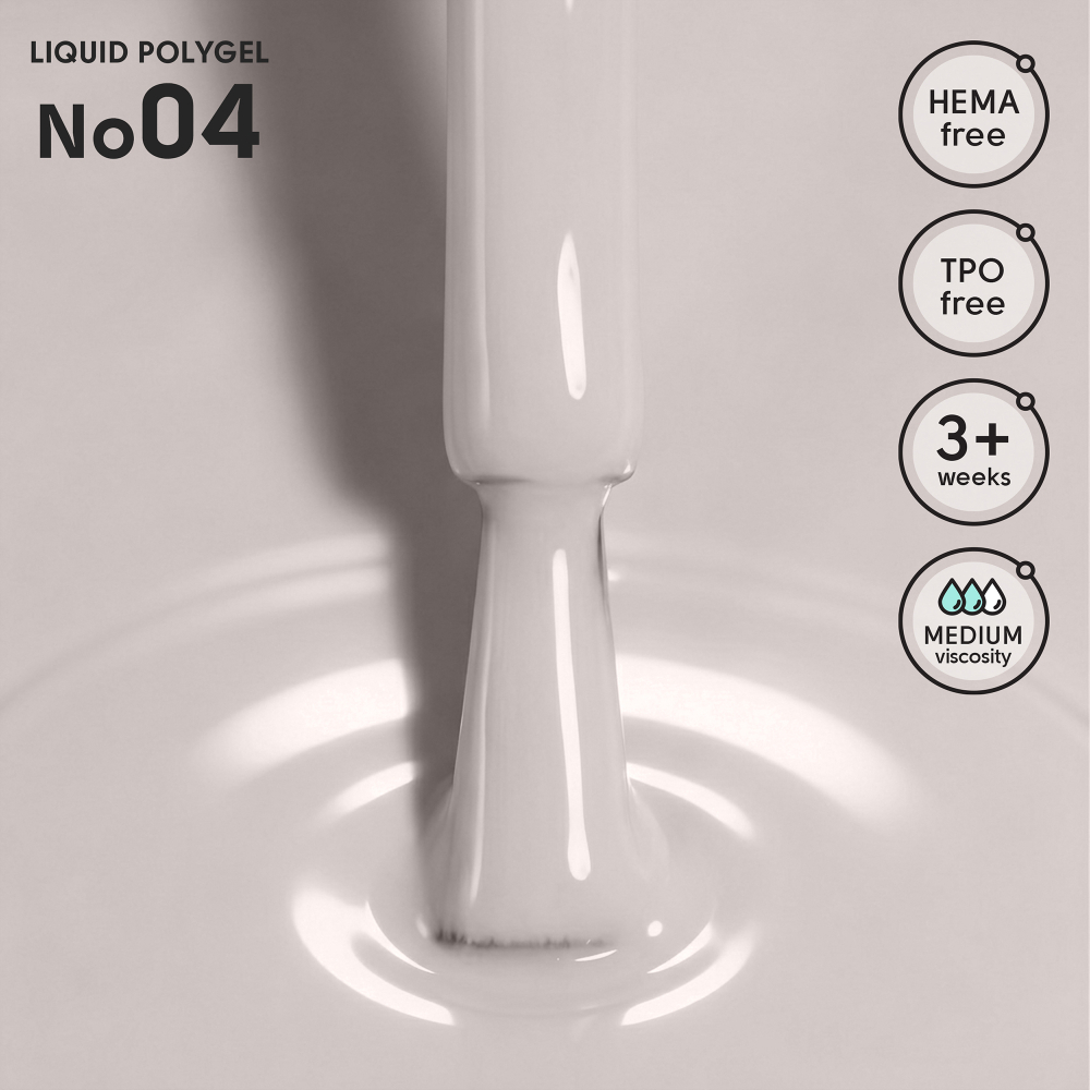 Жидкий полигель, сочетающий свойства геля и акрила, обеспечивая оптимальный баланс прочности и эластичности. Предназначен для укрепления и выравнивания ногтей короткой или средней длины. Имеет среднюю консистенцию, удобную в работе, легко самовыравнивается и позволяет создавать ровную архитектуру ногтевой пластины без перегрузки. Материал обеспечивает стойкость покрытия более 3 недель, сохраняет форму и эстетичный вид. Не содержит HEMA и TPO.